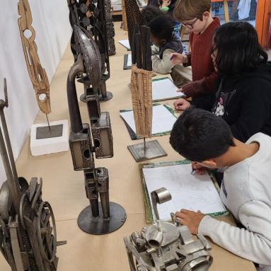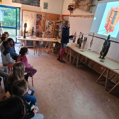 En effet, nous avions invité le sculpteur Christophe Beauvillain à venir rencontrer les élèves et leur présenter son travail et sa vie de sculpteur. Un projet particulier, puisque spontanément proposé par l’Atelier, auquel a répondu avec enthousiasme l’enseignante Catherine Blottiaux. Ses élèves, après avoir pratiqué la sculpture dans nos ateliers sous forme de soudure, bois brûlé, modelage, moulage, assemblage, ont pu rencontrer Christophe Beauvillain. Un moment privilégié, au cours duquel ont fusé questions et réponses, autour des nombreuses œuvres que le sculpteur avait amenées dans l’atelier. Des échanges passionnants, drôles, et très riches d’enseignement sur la créativité et le métier de sculpteur. Un temps fort et inoubliable pour les jeunes artistes, ravis et émerveillés par cette rencontre. Christophe-Beauvillain.com