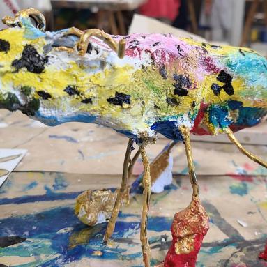 Le thème de l’arbre, retenu pour ce séjour, a été l’occasion pour les élèves d’aborder la sculpture sous différents angles : par moulage en plâtre à partir d’une matrice en argile, ou, comme sur ces photos, par assemblage de matériaux divers (carton, fil de fer, bandes plâtrées). Des recherches préparatoires, sous forme d’études graphiques et colorées sur papier, ont précédé le travail de sculpture, au cours duquel se sont posées, et résolues, de passionnantes question de volume, d’équilibre, et de couleur…