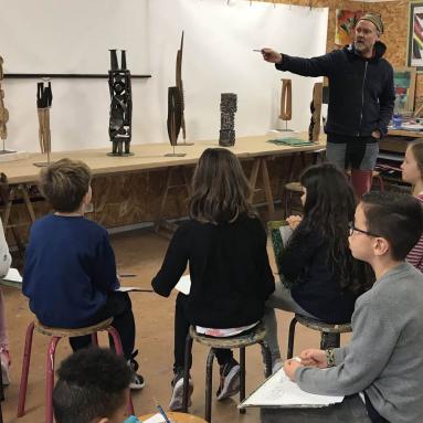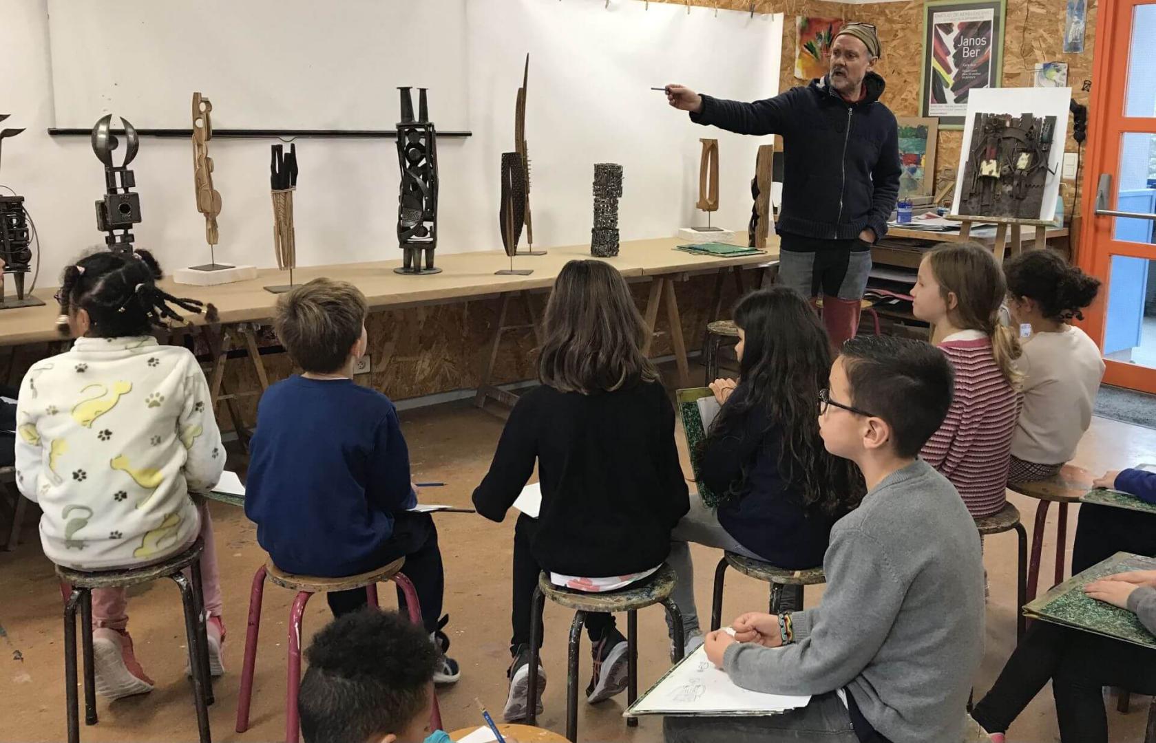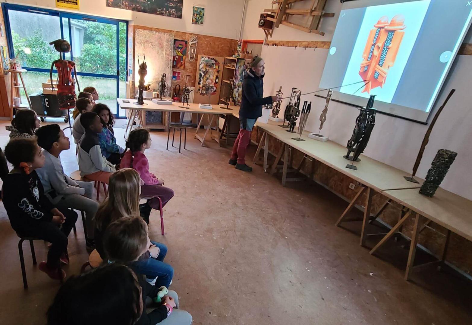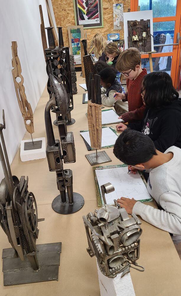 En effet, nous avions invité le sculpteur Christophe Beauvillain à venir rencontrer les élèves et leur présenter son travail et sa vie de sculpteur. Un projet particulier, puisque spontanément proposé par l’Atelier, auquel a répondu avec enthousiasme l’enseignante Catherine Blottiaux. Ses élèves, après avoir pratiqué la sculpture dans nos ateliers sous forme de soudure, bois brûlé, modelage, moulage, assemblage, ont pu rencontrer Christophe Beauvillain. Un moment privilégié, au cours duquel ont fusé questions et réponses, autour des nombreuses œuvres que le sculpteur avait amenées dans l’atelier. Des échanges passionnants, drôles, et très riches d’enseignement sur la créativité et le métier de sculpteur. Un temps fort et inoubliable pour les jeunes artistes, ravis et émerveillés par cette rencontre. Christophe-Beauvillain.com